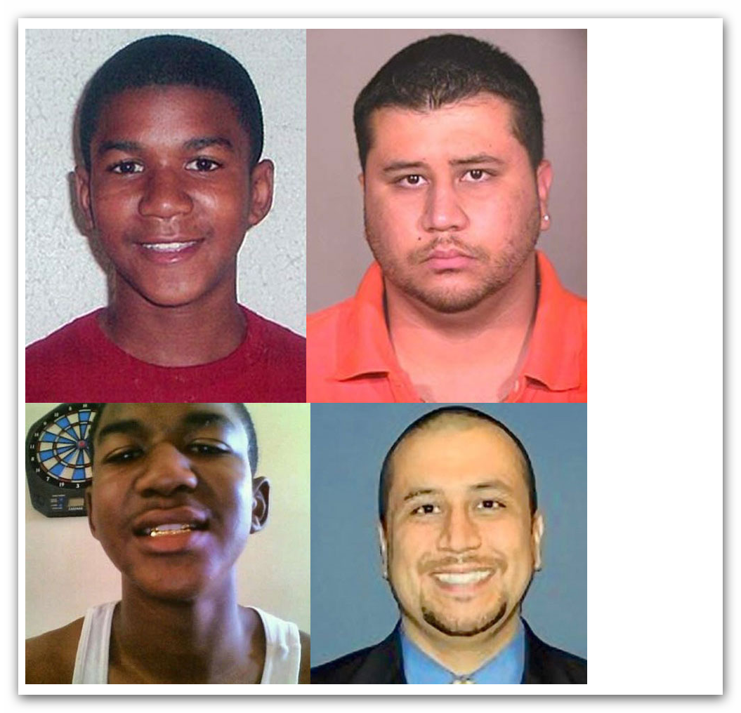 The photo above depicts a cherubic preadolescent Martin next to a surly and hostile looking Zimmerman. Below that is a more current Martin photo sporting gang-favored gold capped teeth and a smiling Zimmerman.